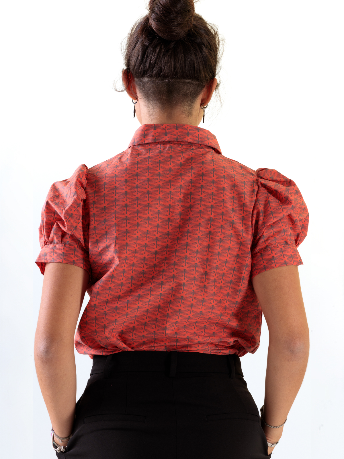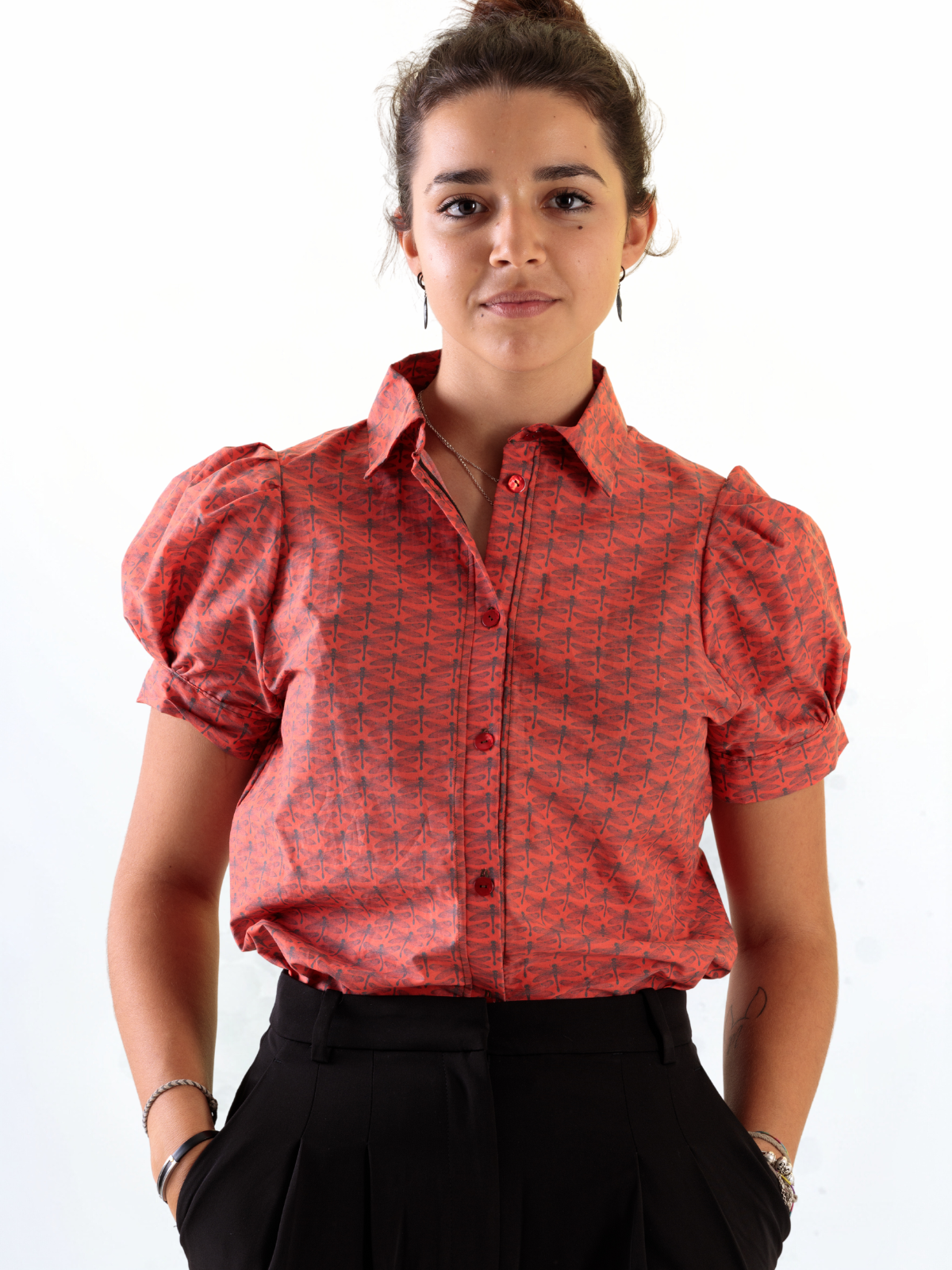 Camicia stampa All-Over, taglio classico, stondata sul fondo, collo a punta, manica corta.