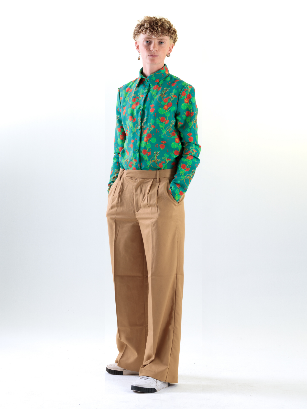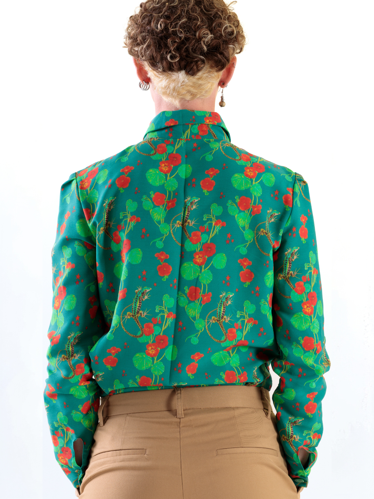 Camicia stampa All-Over, taglio classico, stondata sul fondo, collo a punta, manica lunga.